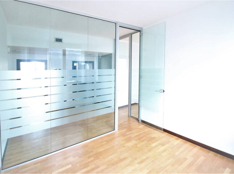 – Porte degli uffici con profili di alluminio con porta e pannelli laterali in vetro serigrafato, e in materiale opaco quale legno laccato bianco;