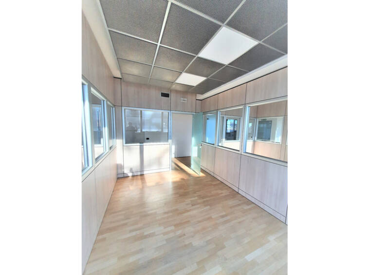 – Porte degli uffici con profili di alluminio con porta e pannelli laterali in vetro serigrafato, e in materiale opaco quale legno laccato bianco;
