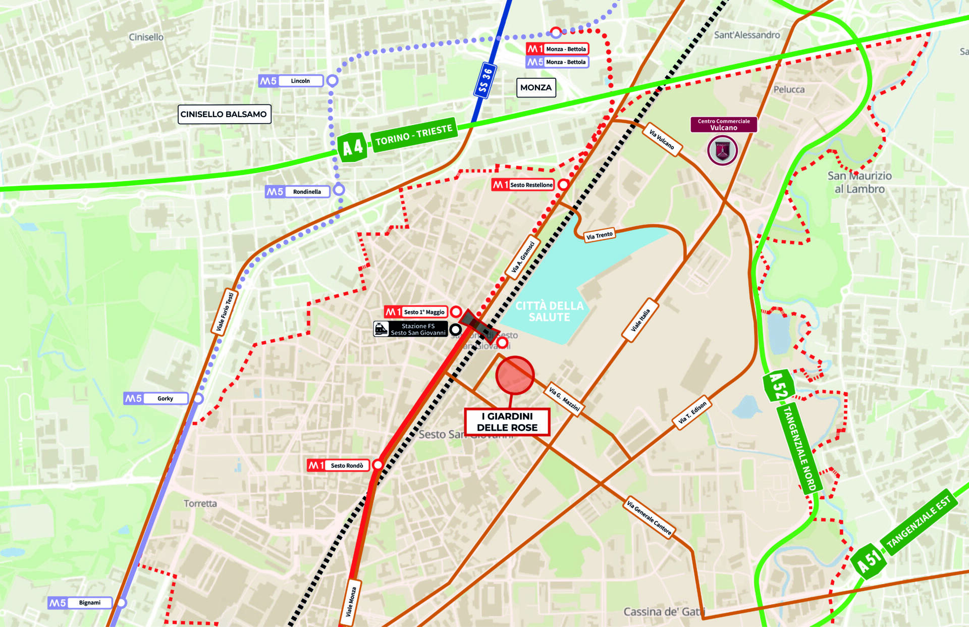 Nelle immediate vicinanze si trova anche la stazione ferroviaria di Sesto San Giovanni, sulla linea Milano–Monza–Lecco, che offre ulteriori collegamenti rapidi con il centro città e l’hinterland.