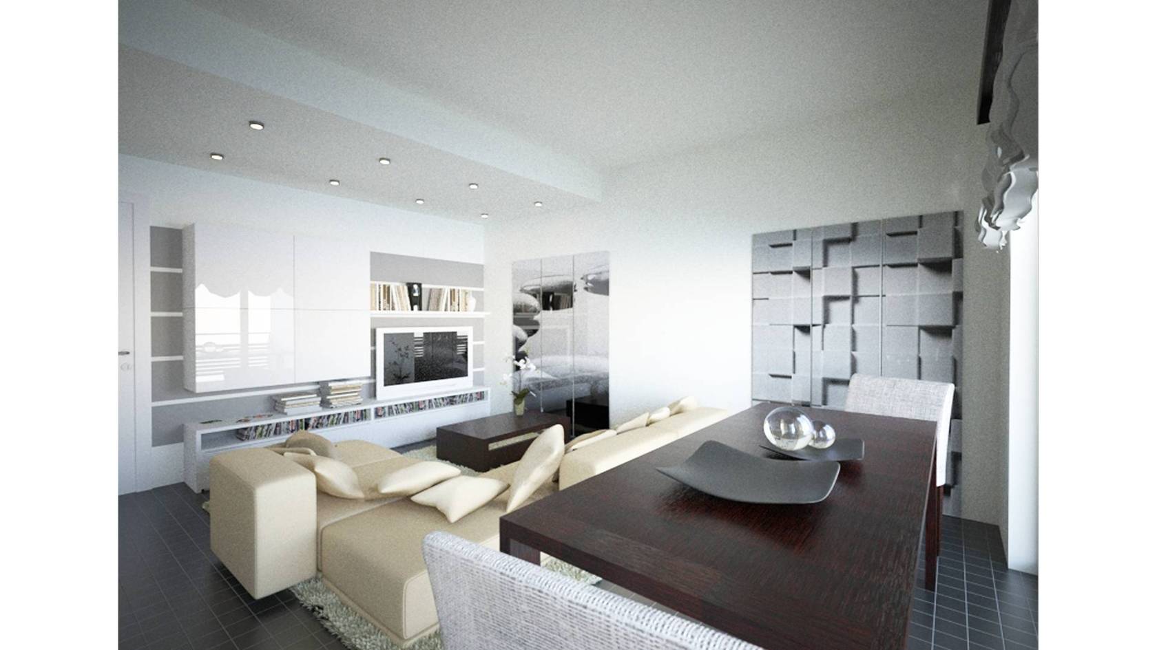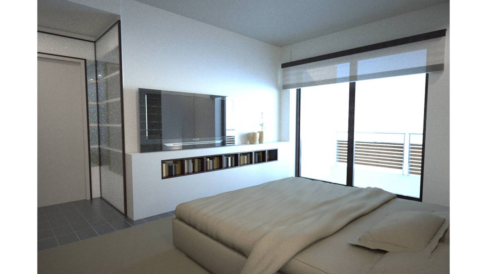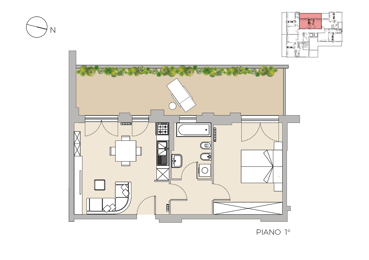Luminoso bilocale di 51 mq interni, composto da ampio soggiorno con angolo cottura, camera da letto matrimoniale, balcone di 24 mq e servizi.