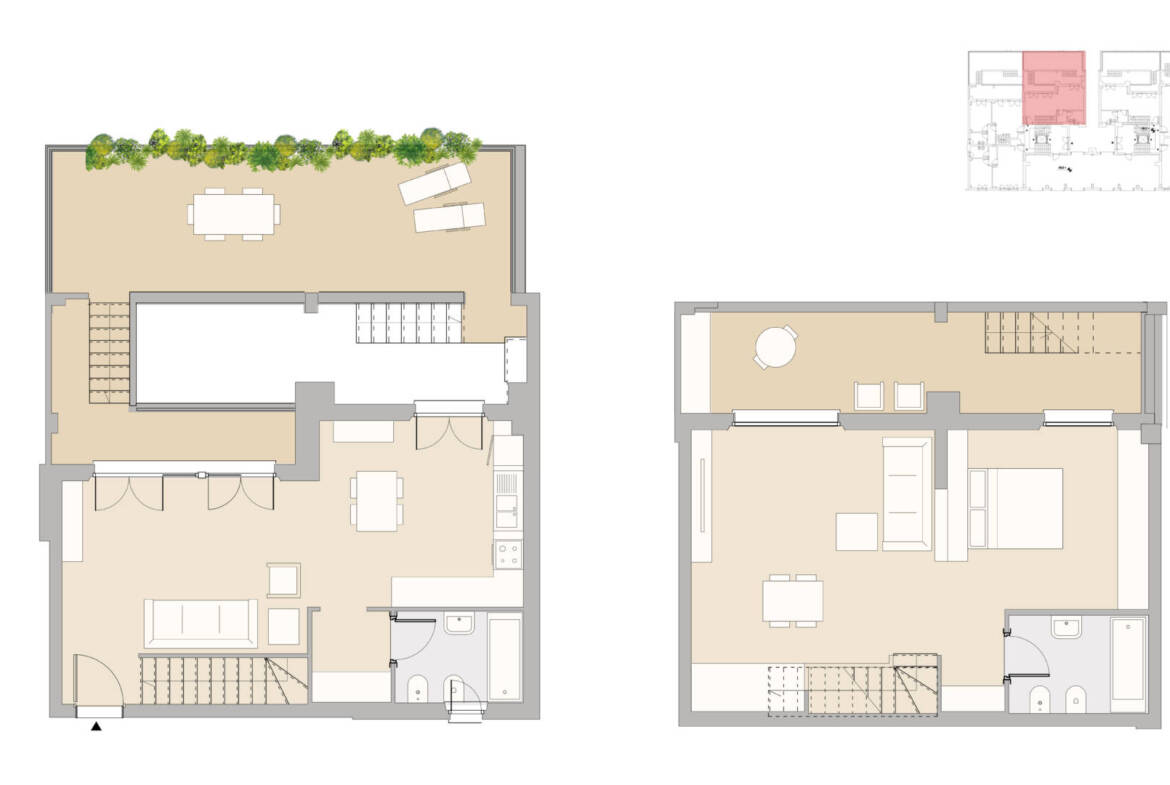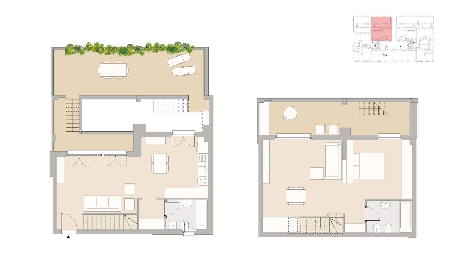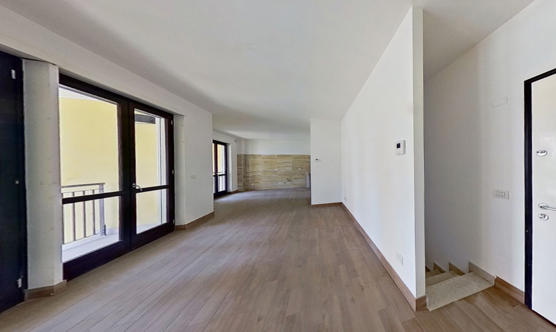 Luminoso Bilocale composto da ampio soggiorno, cucina a vista, balcone e servizi. Attraverso la scala interna, o tramite il balcone/terrazzo esterno, si accede ad una spaziosa taverna di 55 mq, facilmente divisibile per poter creare ulteriori ambienti.